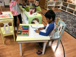 Young children have to be taught how to take one set of work materials from the shelves, work with it on a table or a rug, and place it back when done. They also learn how to be respectful around another child’s work, not interfering or knocking it over. By practicing “walking on the line”, children learn how to walk in a classroom instead of running, how to hold one object at a time with two hands, how to use their inside voice, as well as other lessons of grace and courtesy.
