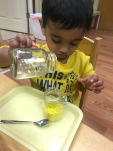 It was the genius of Dr. Maria Montessori that brought everyday household tasks such as cleaning the table, sweeping the floor, buttoning a shirt, getting a glass of water, washing hands, watering a plant, etc. as classroom curriculum. These lessons not just help the child in achieving a sense of confidence and independence, but also serve to calm overactive children and develop their focus and attention span. These lessons are a necessary and important step in paving the way for academics and are typically designed with hidden academic agenda.