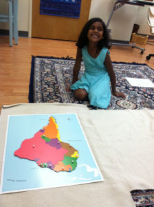 The young children initially learn the names of the different continents, and subsequently learn to focus on individual continents with the help of control maps, learning about the weather, language, people, culture, native animals, etc. in those regions of the world. Children are also exposed to land and water forms, components of the solar system, and so on as elements of geography.